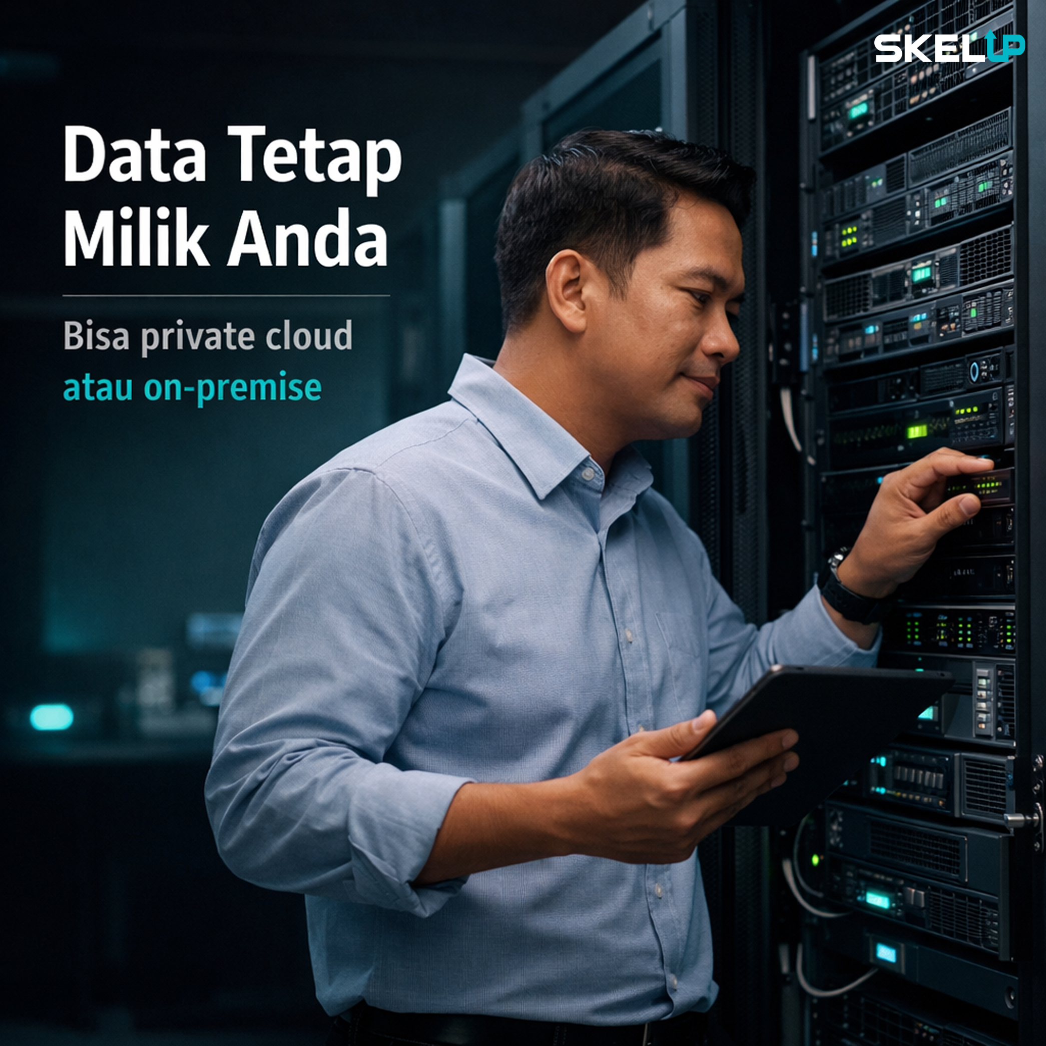 Butuh data yang lebih “terkendali”? Skelup bisa ditempatkan di infrastruktur pilihanmu—private cloud atau on‑premise—dengan pemisahan data yang jelas.